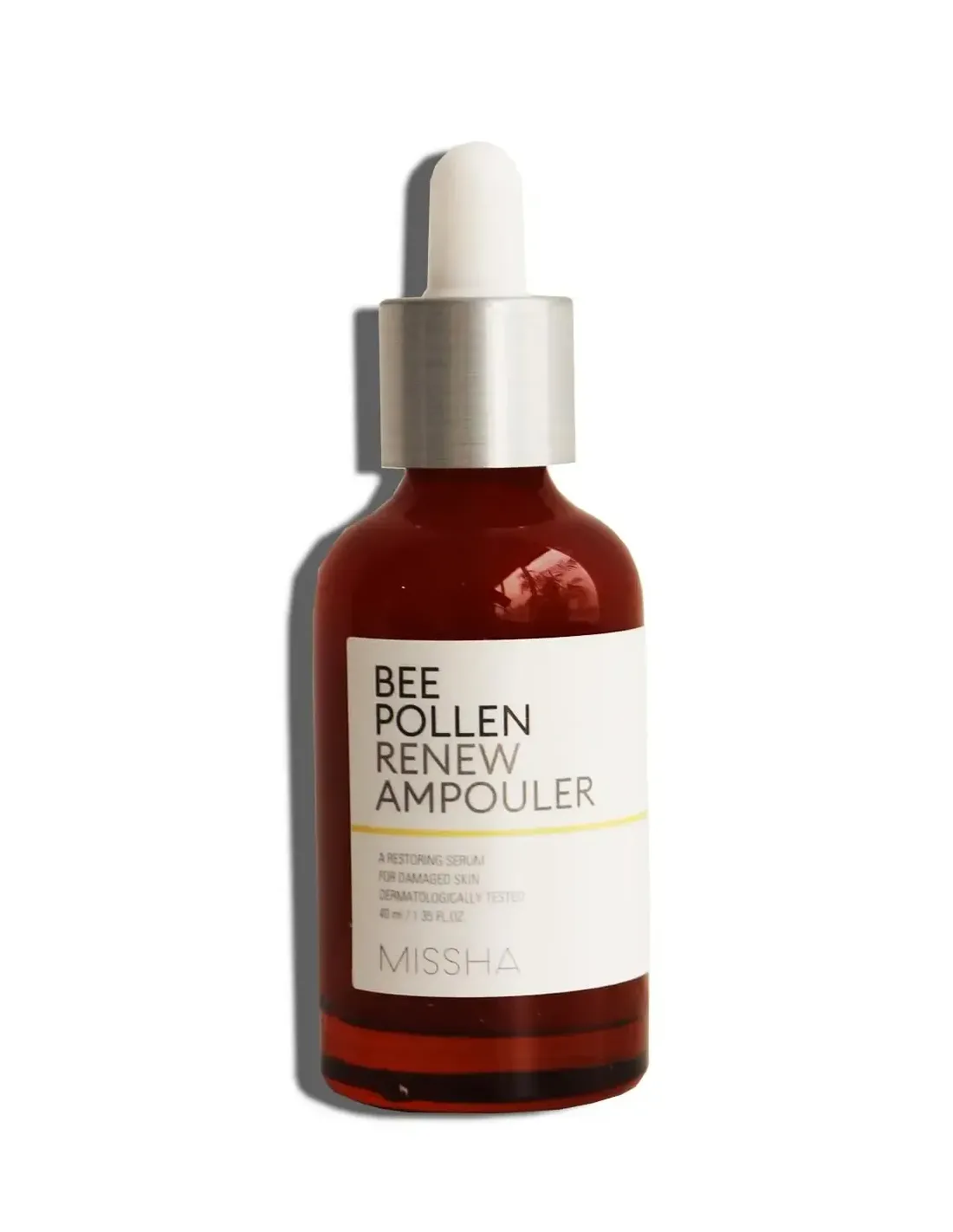 Missha Bee Pollen Renew Ampoule styrker hudens energi med 42% bipollen ekstrakt, der beroliger skadet hud og øger hudens densitet.